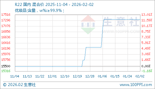 02月02日R22价格17333.33元/吨 60天上涨11.83%
