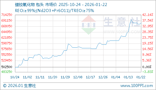 据生意社监测,镨钕氧化物01月22日最新价格682500.00元/吨,最近10天上涨6.23%,15天上涨10.08%,20天上涨11.89%,30天上涨13.75%,60天上涨24.66%。