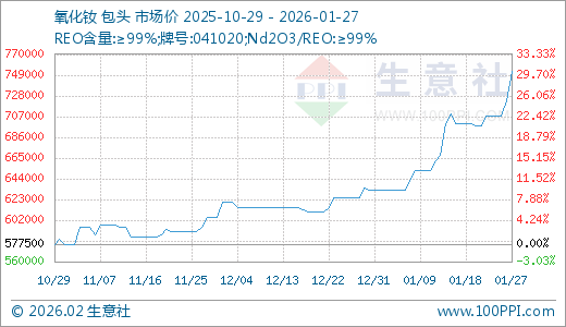 01月27日氧化钕752500.00元/吨 5天上涨6.36%