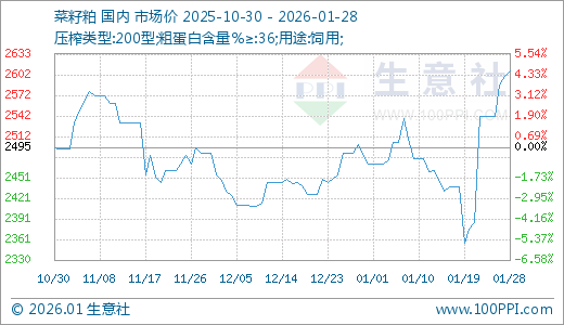 01月28日菜籽粕2608.00元/吨 10天上涨6.97%