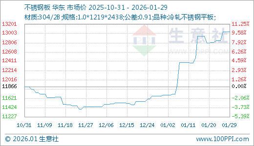 01月29日不锈钢板13036.67元/吨 30天上涨11.74%