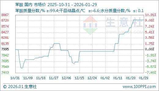 01月29日苯胺8745.00元/吨 30天上涨10.07%