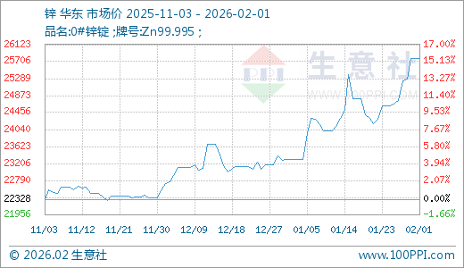 据生意社监测,锌02月01日最新价格25776.00元/吨,最近5天上涨4.14%,10天上涨6.09%,30天上涨10.62%,60天上涨13.23%。