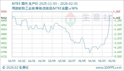 02月01日MTBE价格5023.33元/吨 5天上涨3.43%