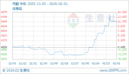02月01日丙酮4700.00元/吨 20天上涨11.37%