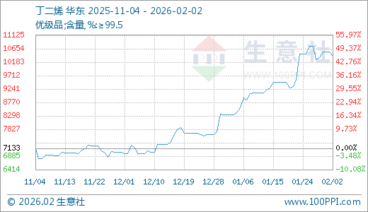 02月02日丁二烯10400.00元/吨 15天上涨9.86%