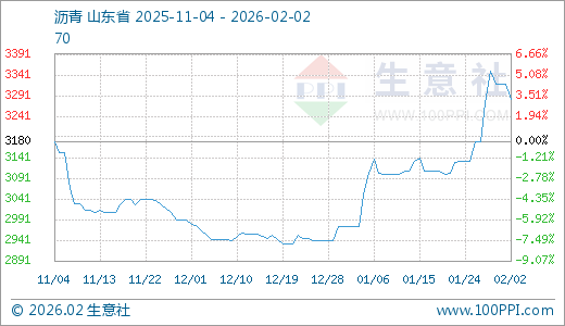 02月02日沥青3283.33元/吨 30天上涨10.43%