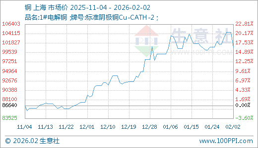 据生意社监测,铜02月02日最新价格100853.33元/吨,最近60天上涨10.57%。