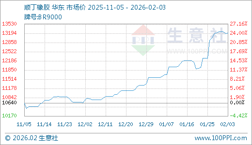 02月03日顺丁橡胶13200.00元/吨 10天上涨7.49%
