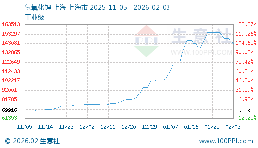 02月03日氢氧化锂143000.00元/吨 30天上涨39.06%