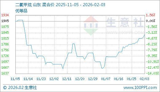 02月03日二氯甲烷1837.50元/吨 30天上涨10.36%