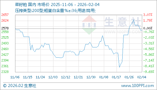 02月04日菜籽粕2570.00元/吨 15天上涨8.16%