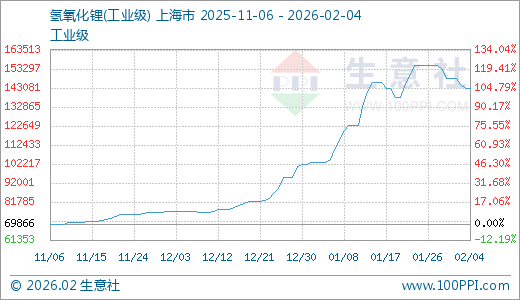02月04日氢氧化锂143000.00元/吨 30天上涨36.41%