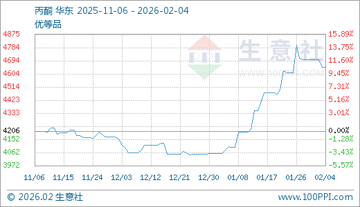 02月04日丙酮4650.00元/吨 30天上涨13.28%