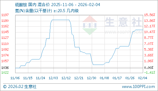 02月04日硫酸铵1153.33元/吨 30天上涨10.19%