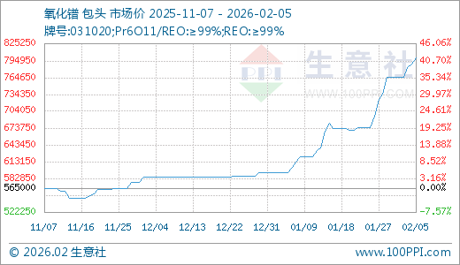 02月05日氧化镨800000.00万元/吨 5天上涨4.58%