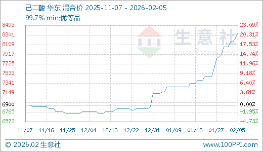 02月05日己二酸8333.33元/吨 5天上涨3.31%
