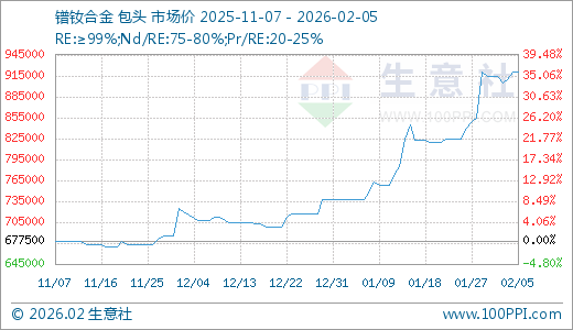 02月05日镨钕合金920000.00元/吨 10天上涨9.52%