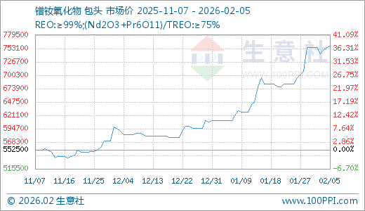 02月05日镨钕氧化物757500.00元/吨 10天上涨8.99%