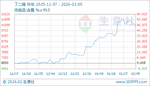 02月05日丁二烯10066.67元/吨 15天上涨7.78%