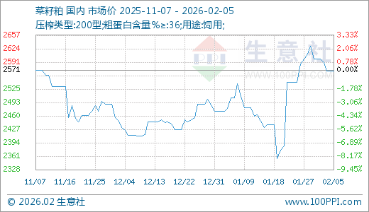 02月05日菜籽粕2570.00元/吨 15天上涨7.71%
