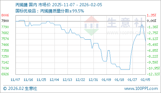 02月05日丙烯腈7533.33元/吨 15天上涨7.36%