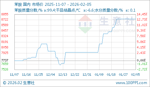 02月05日苯胺8745.00元/吨 30天上涨10.07%