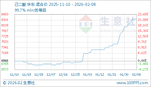 02月08日己二酸8333.33元/吨 10天上涨5.49%
