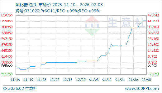 02月08日氧化镨805000.00万元/吨 10天上涨5.23%
