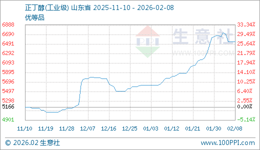 02月08日正丁醇6533.33元/吨 20天上涨10.11%