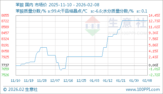 02月08日苯胺8745.00元/吨 60天上涨14.13%