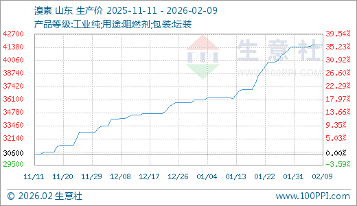 02月09日溴素41600.00元/吨 30天上涨14.73%