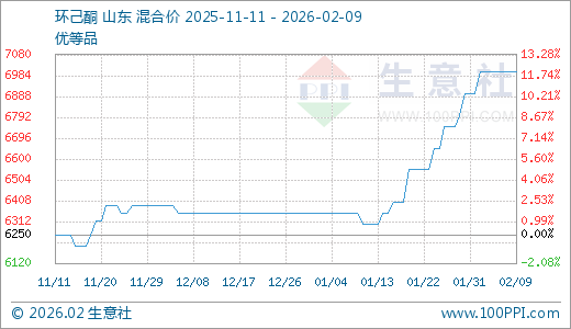 02月09日环己酮7000.00元/吨 30天上涨11.11%