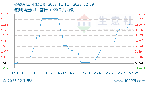 02月09日硫酸铵1166.67元/吨 30天上涨10.76%