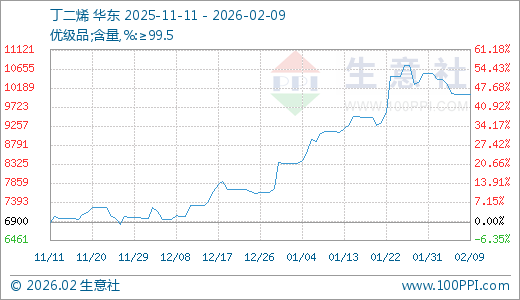 02月09日丁二烯10033.33元/吨 30天上涨10.05%