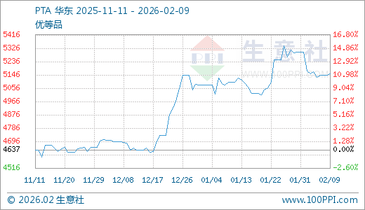 02月09日PTA价格5151.86元/吨 60天上涨10.75%