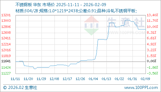 02月09日不锈钢板12725.00元/吨 60天上涨10.38%