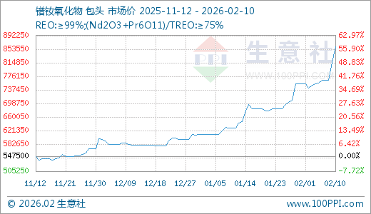 02月10日镨钕氧化物860000.00元/吨 5天上涨13.53%