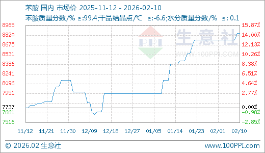 02月10日苯胺8845.00元/吨 60天上涨15.24%