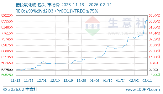 02月11日镨钕氧化物860000.00元/吨 5天上涨12.42%