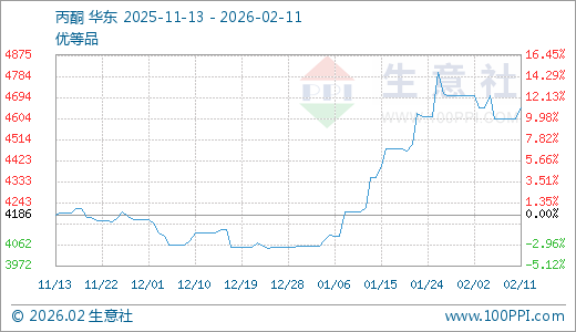 02月11日丙酮4650.00元/吨 30天上涨10.19%