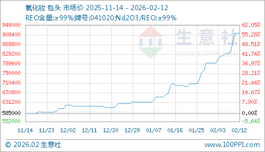 02月12日氧化钕915000.00元/吨 5天上涨9.91%