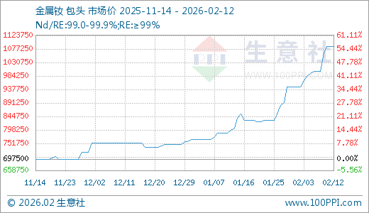 02月12日金属钕1085000.00元/吨 5天上涨8.50%