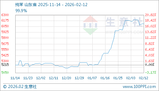 02月12日纯苯6110.00元/吨 30天上涨14.49%