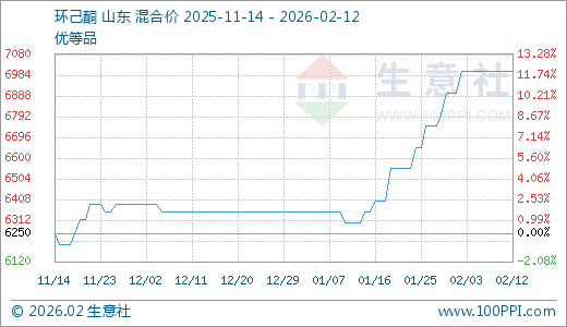 02月12日环己酮7000.00元/吨 30天上涨11.11%