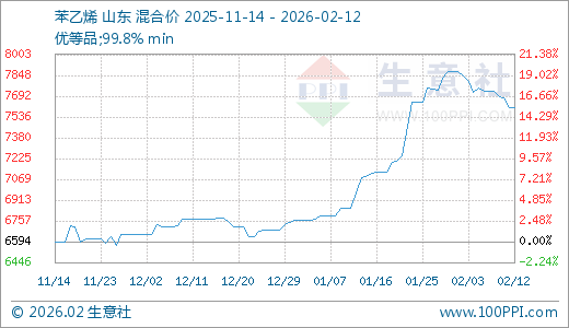 02月12日苯乙烯7608.00元/吨 60天上涨12.38%