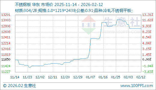 02月12日不锈钢板12725.00元/吨 60天上涨10.41%