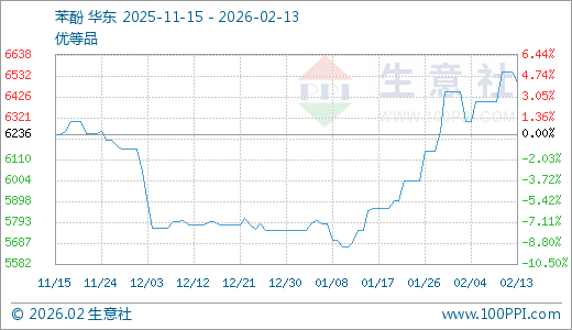02月13日苯酚6500.00元/吨 30天上涨13.04%