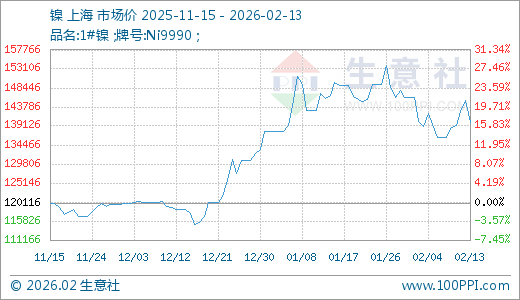 02月13日镍140100.00元/吨 60天上涨19.10%