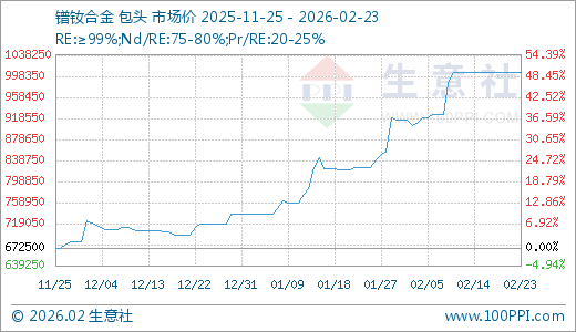 02月23日镨钕合金1005000.00元/吨 15天上涨8.65%